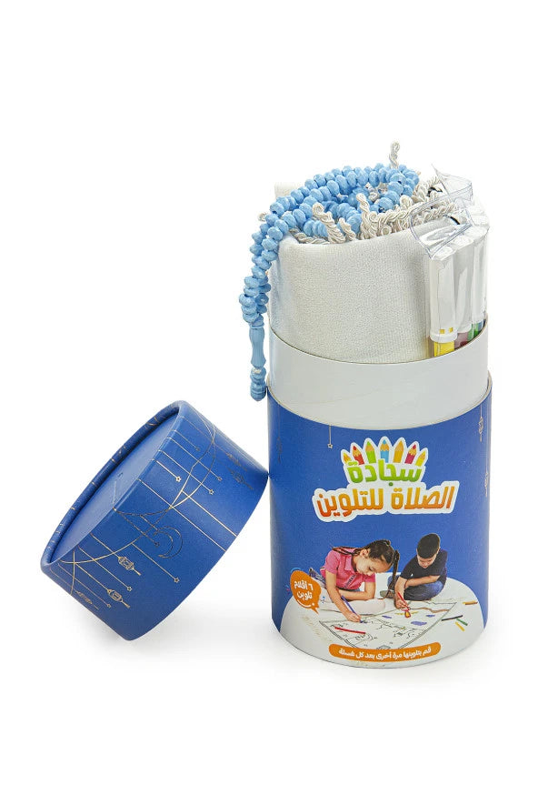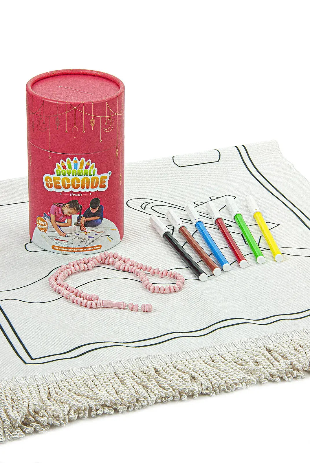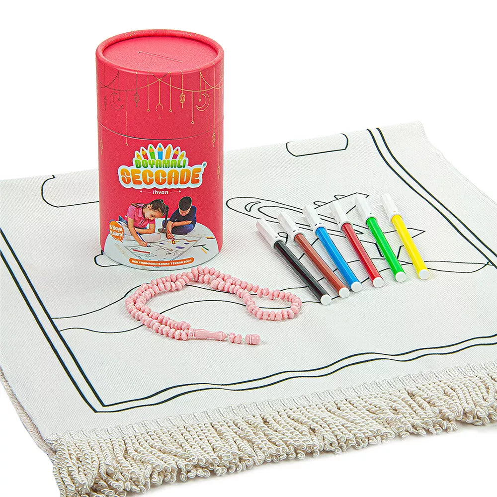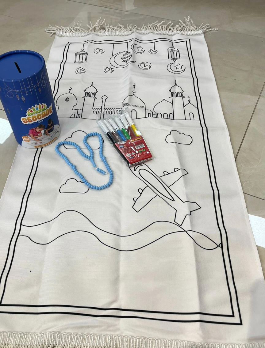 Kutunun içinden 1 adet boyamalı seccade (70x110 cm), 6 adet farklı renkte yıkanabilir boya kalemi, 1 adet tespih ve özel tasarım hediye kutusu çıkar.